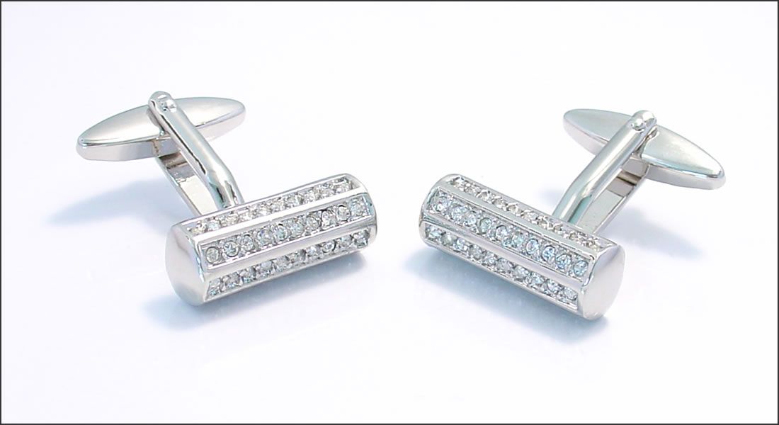Bouton de manchette cylindre argenté serti de cristaux blancs
